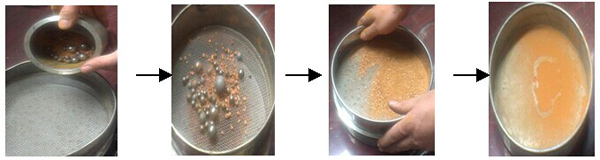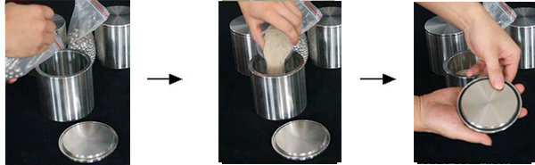 把球磨罐中的物料和磨球倒入一個(gè)小塞中,用塞子分離磨球和物料,再用塞子分離一次物料。最后把需要的物料倒入樣品袋中。