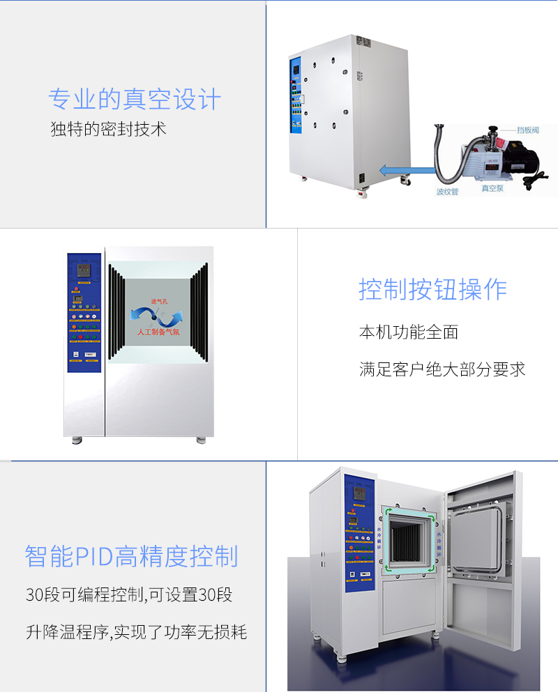 ▪控溫精密,具備多種控溫器可供選擇,溫度波動小(控溫精度±1℃)。真空度最高可達到0.1兆帕,正壓可到0.09兆帕。