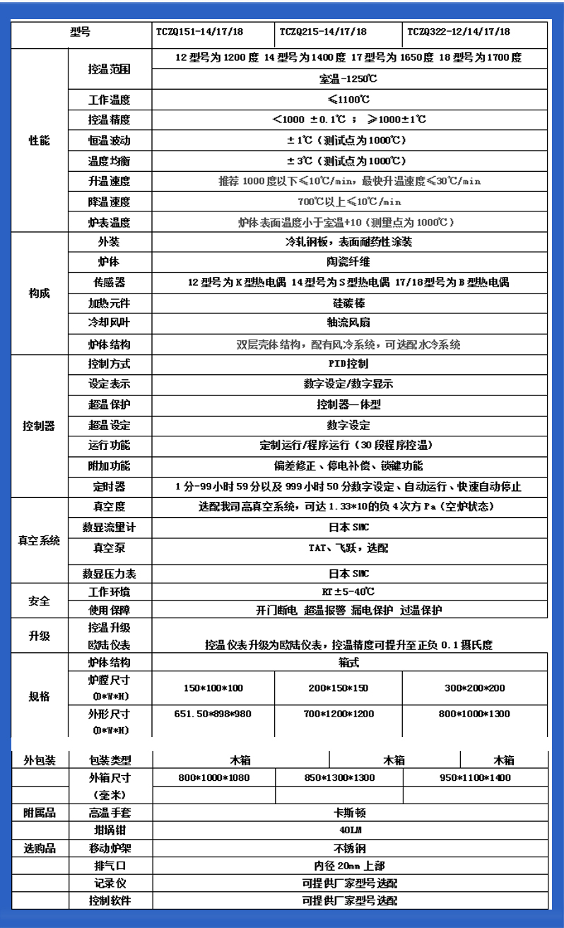 ▪ 加熱元件1200攝氏度,1400攝氏度,1700攝氏度,采用優質高電阻優質合金絲OCr27FAI7Mo2,優質硅碳棒,優質硅鉬棒,最高發熱溫度可達1200攝氏度,1400攝氏度,1700攝氏度。