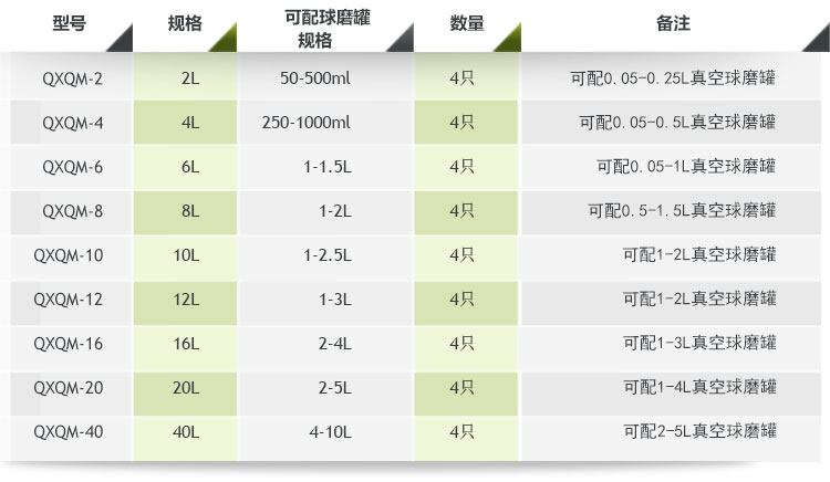 表一: 360度旋轉行星球磨機配罐參考