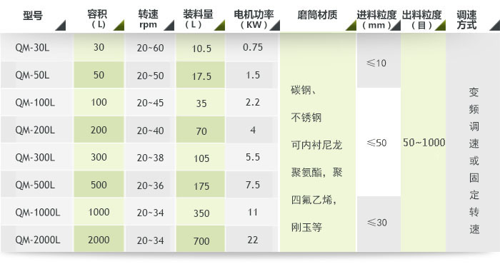 1. 型號(hào)說明:QM-(體積)-(A調(diào)速型,B普通型) 如:QM-50-A 為50L調(diào)速型輥筒球磨機(jī);